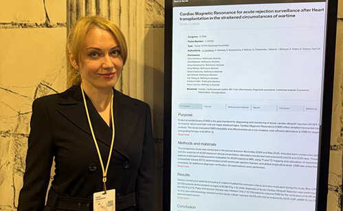 Olha Ushakova, Head of the Department of Radiology, presented a poster entitled “Cardiac Magnetic Resonance for Acute Rejection Surveillance after Heart Transplantation in the Straitened Circumstances of Wartime”, prepared together with a team of cardiologists, cardiac surgeons, and transplant specialists.