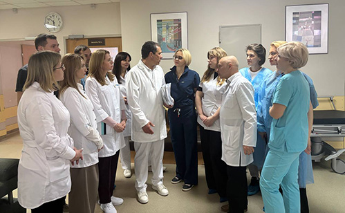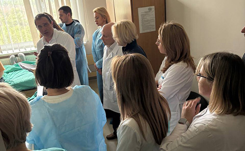 The attendees were introduced to the work of the departments of myocardial pathology, organ and tissue transplantation, cardiac rhythm disorders, adult intensive care, endovascular surgery, and angiography, and took part in clinical rounds.